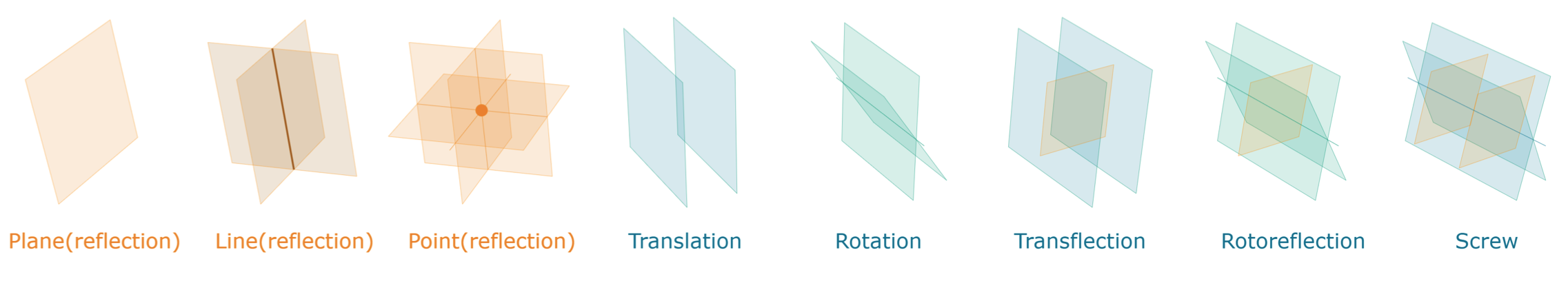 All elements of the Euclidean group can be represented as compositions of reflections in planes. The orange k-blades are compositions of orthogonal planes, and represent simultaneously the points, lines, planes as well as the reflections in these elements. In green: compositions of reflections in arbitrary planes make up all isometric transformations