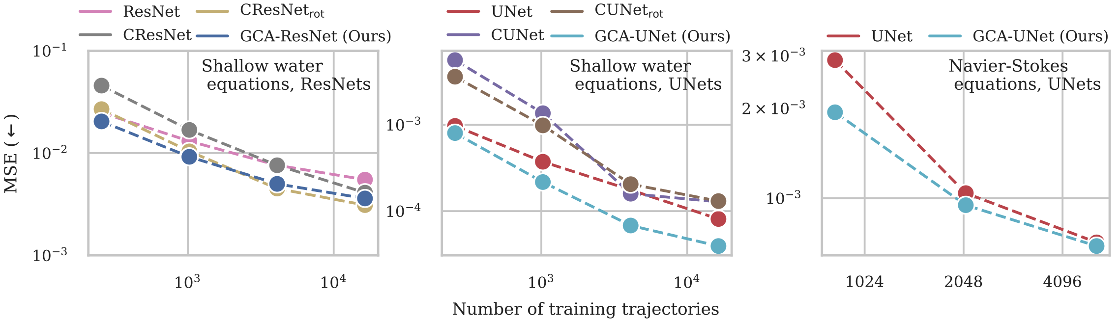 MSE results of the large-scale fluid mechanics experiments as a function of the number of training trajectories. The authors compare ResNet (left) and UNet (center) models on the shallow water equations. Right: UNet comparison on the Navier-Stokes equations.