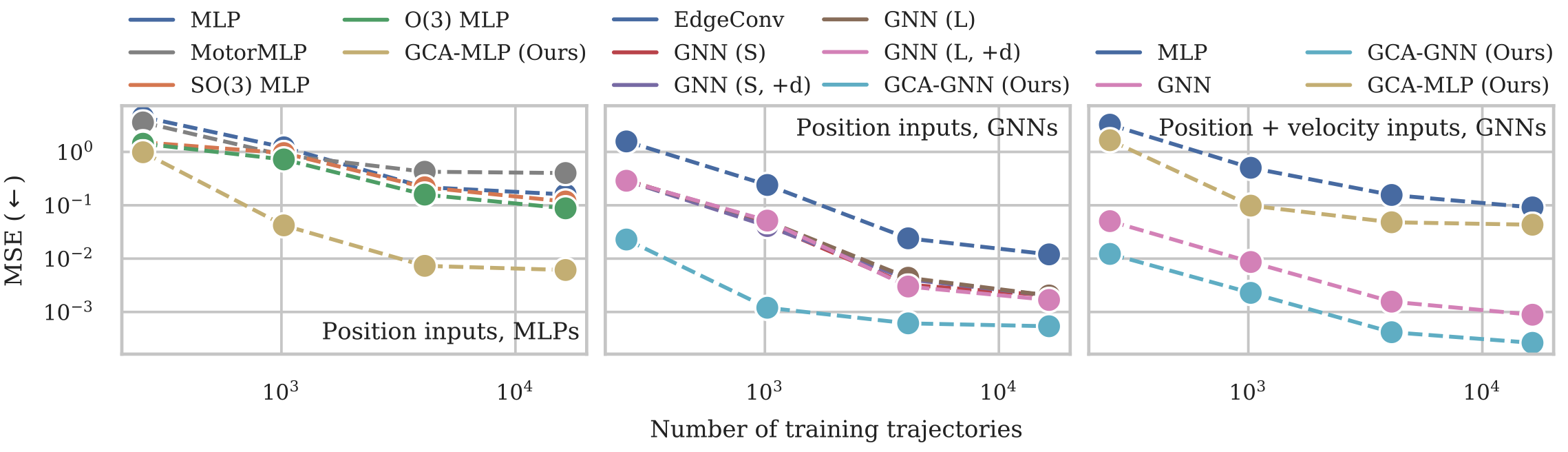 Test MSE results of the Tetris experiment as a function of the number of training trajectories. Left: comparison of different MLP models, center: comparison of different GNN models, right: comparison of the best MLP and GNN models when velocities are included.